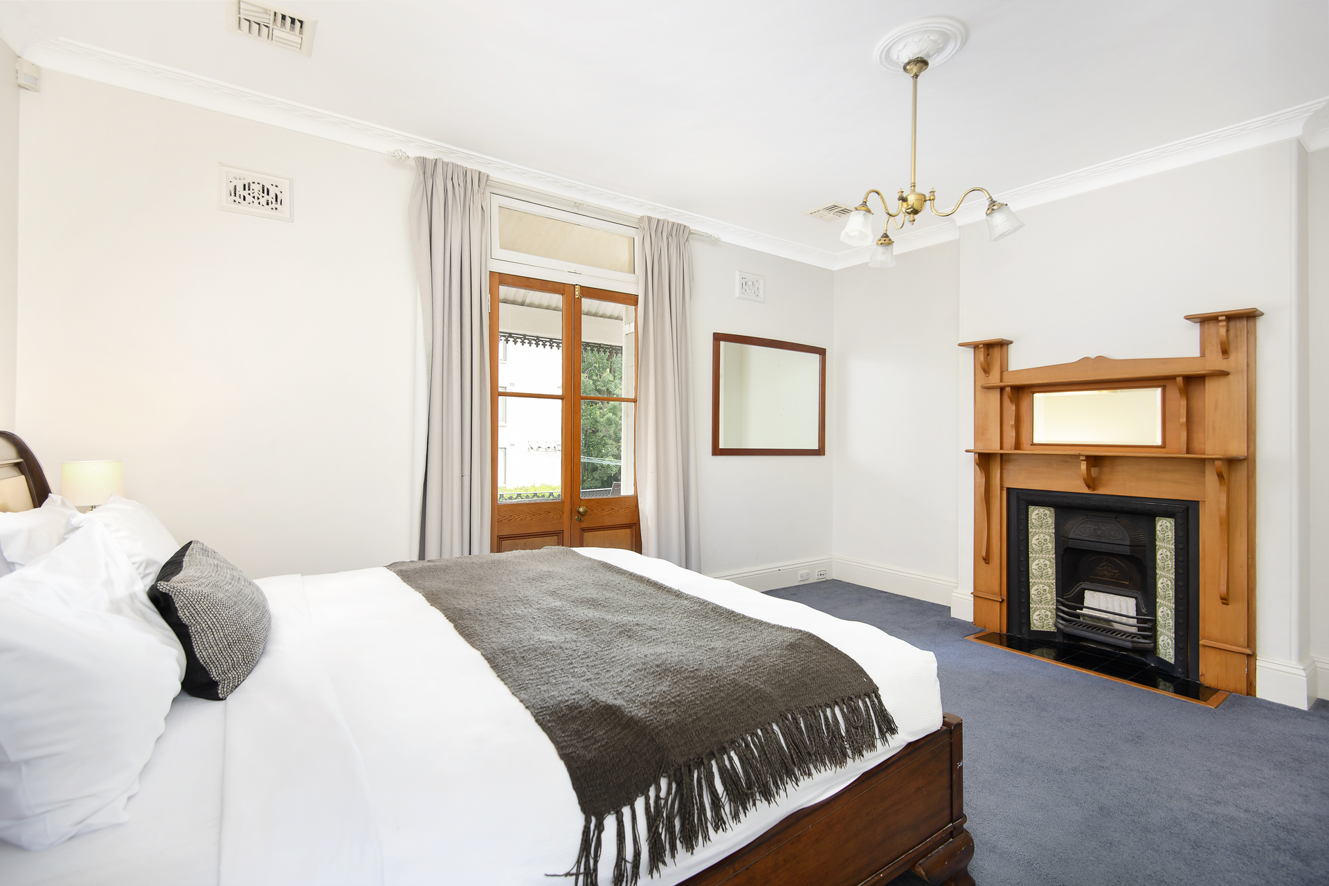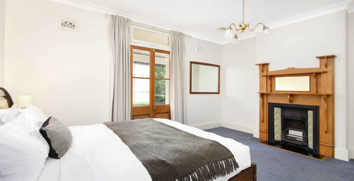 -Master bedroom opening to balcony with feature fireplace